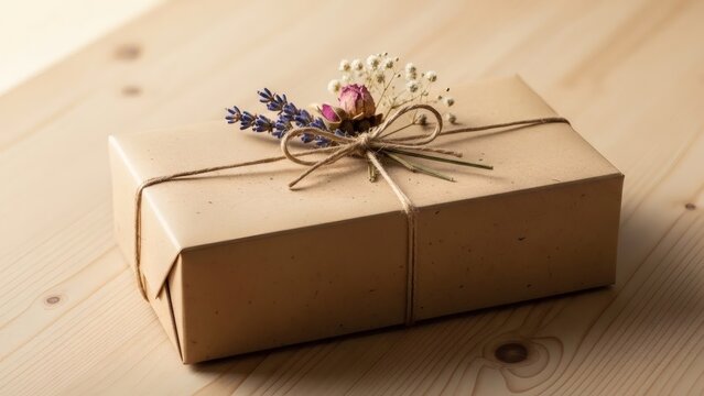 Christmas gift. Congratulations.Top wiew of woman holding traditional decorated gift box. Wooden table with cane,fir branches,fir cone, and berries