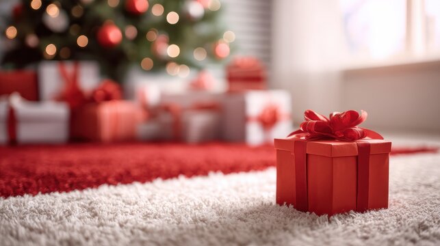 red christmas gift lying alone on a living room floor on the edge of a white rug overlaying a red carpet with additional gifts and the bottom of the decorated christmas tree in the distance no logos