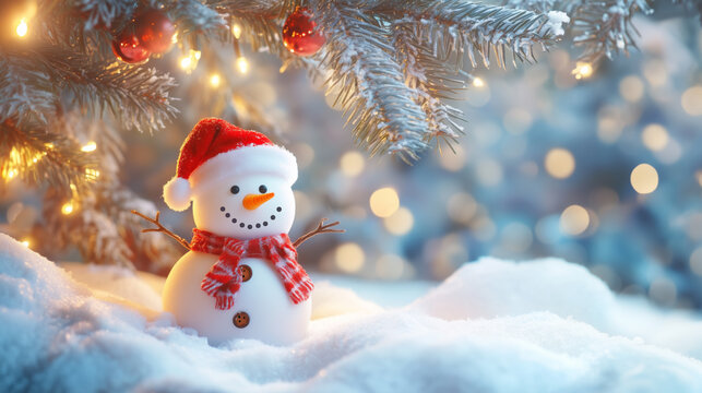 Cheerful snowman wearing a Santa hat and scarf, surrounded by snow under a beautifully decorated Christmas tree with glowing lights