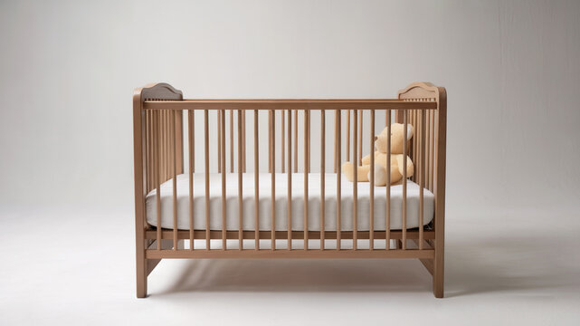 The baby’s room showcases a large teddy bear beside wooden toys, with baby onesies neatly hanging on a shelf, creating a warm and inviting atmosphere
