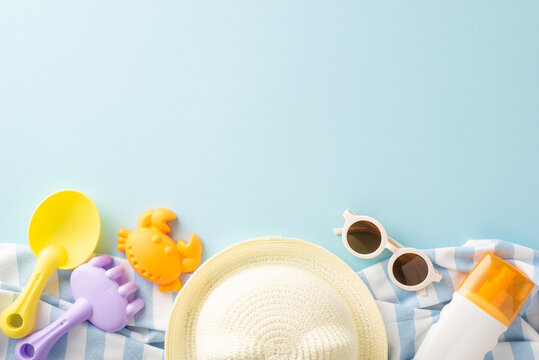 A collection of colorful children's beach toys, sunglasses, sunscreen, and a straw hat laid out on a light blue background, ready for a sunny beach day