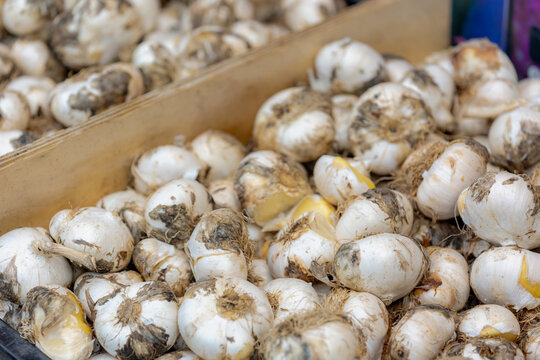 Selective focus of white Allium bulbs or roots, Staked of onions in wooden market stall, A large genus of monocotyledonous flowering plant genus in the family Amaryllidaceae, Natural floral background