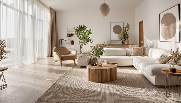 A rustic, boho-style home decor display featuring woven baskets, woven fabric, and various decorative items on a wooden shelf and table.