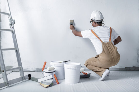 a man paints a white wall with a roller. Repair of the interior. Young male decorator painting a wall in the empty room, concept builder or painter in helmet with paint roller over the empty room