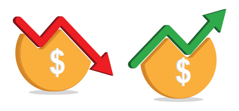 price or rate increase and decrease icon, 3d set of cost symbol dollar, money, coin sign with arrow up and down. transparent vector illustration
