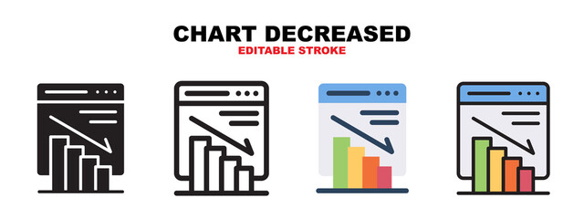 Chart Decreased icon set with different styles. Icons designed in filled, outline, flat, glyph and line colored. Editable stroke and pixel perfect. Can be used for web, mobile, ui and more.
