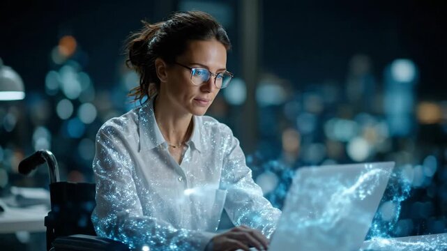AI in Accessibility: Empowering a Woman in a Wheelchair Working on Laptop with Digital Glow