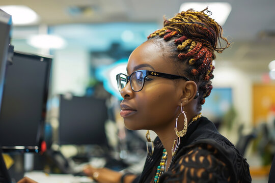 In a bustling telemarketing call center, a dedicated black woman serves as a trusted advisor, providing expert consultation on loan advice and financial matters to customers