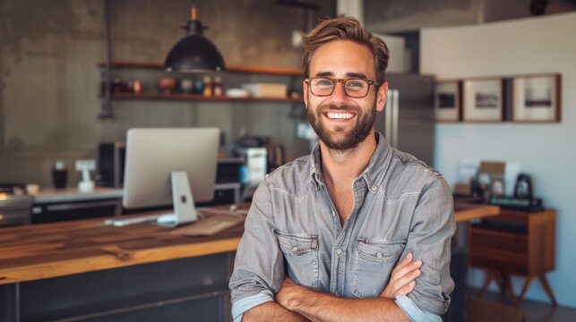 male physician smiling at camera with stethoscope bright hospital branding photo professional image three quarter wide angle cinematic color correction gentle backlight clean
