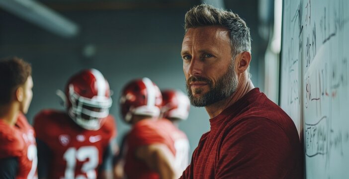 focused football coach stands in training facility, surrounded by players in red uniforms. atmosphere is intense, reflecting dedication and teamwork