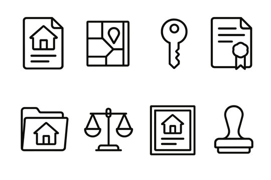 Property & Ownership outline icon set: house deed, land map, key icon, title document, real estate folder, balance scale, ownership certificate, notary stamp.