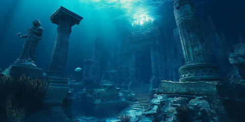 A mysterious 3D background of an ancient underwater city. Coral-covered ruins stretch into the deep blue, illuminated by strange bioluminescent creatures. Cracked statues of forgotten deities stand