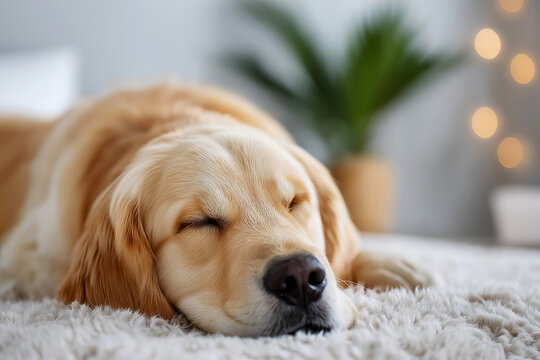 Golden retriever dog lying down relaxed on soft rug after deep conditioning and de-shedding, showcasing a peaceful and cozy atmosphere, creating a cozy vibe