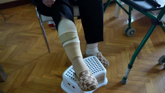 Old woman lifting her pants to show special stockings for blood circulation
