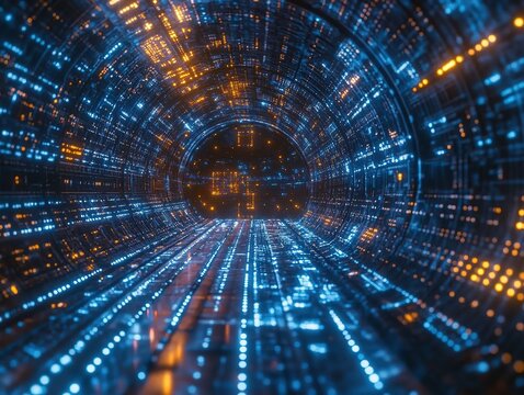 Futuristic Tech Tunnel Background: Interwoven Blue Binary Electronic Lines in Space Capsule Passage. Cybernetic Light-Shadow Network with Dynamic Geometry
