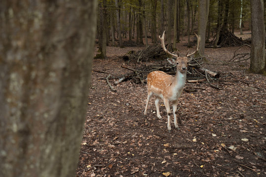 The deer stands in a clearing in the forest, its head slightly turned to the side.