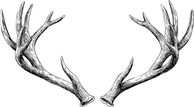 Deer Horn vector illustration. Drawing of reindeer Antler painted by black inks in outline style. Hand drawn sketch of dry bare branch. Etching of buck stag part of skull. Engraving of leafless bough.