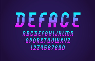 Bright damaged font, trendy colored cutting alphabet, modern letters and numbers, for your designs: logo, t-shirt, card, poster, letterpress, vector illustration 10EPS
