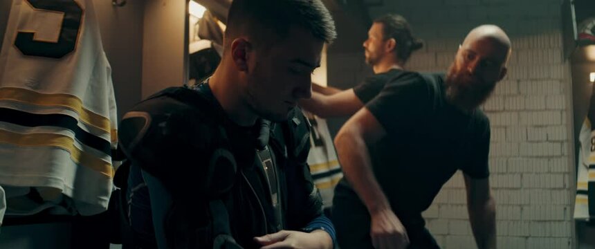Teammates cheering up disappointed ice hockey player in the locker room after the game. Shoot with 2x anamorphic lens