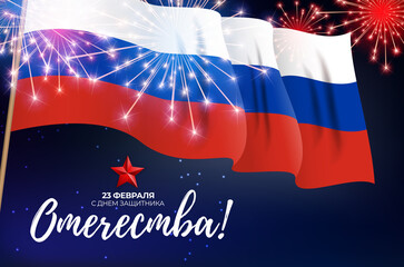 23 February, Happy Defender of the Fatherland Day, - inscription on Russian language, cyrillic letters. Horizontal vector illustration card template with star, flag for web banner and greeting cards.