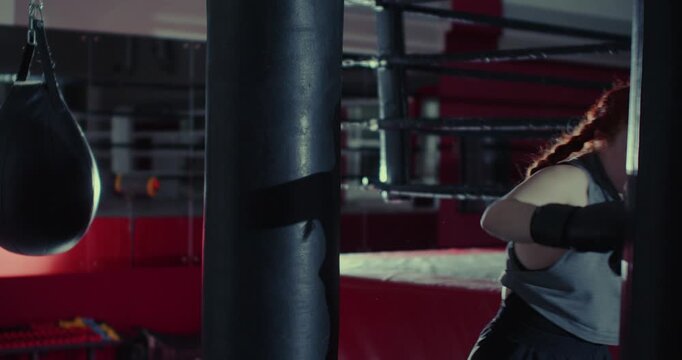 Determined adolescent girl in boxing gloves training with group of teenagers in gym, punching pads in hands of coach during workout ..