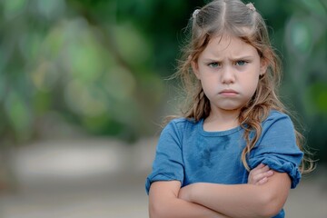 A young girl wearing a blue dress stands outdoors, frowning deeply with her arms crossed