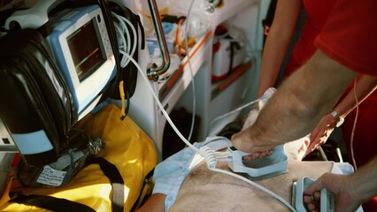 Medical team using defibrillator on the patient in ambulance car