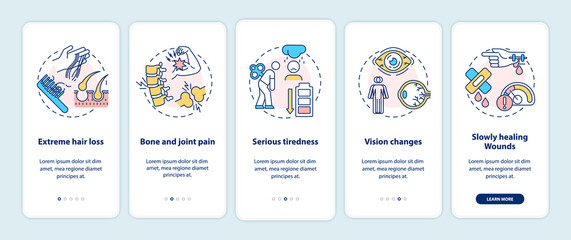 Vitamin deficiency symptoms onboarding mobile app page screen with concepts. Hair loss, joint pain, tiredness walkthrough 5 steps graphic instructions. UI vector template with RGB color illustrations