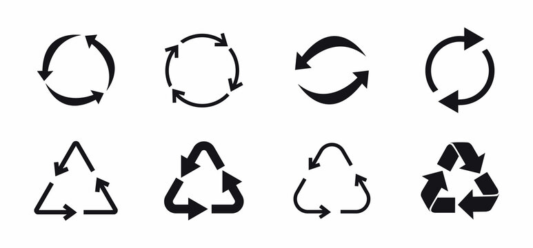 Recycle icons set. Recycling and rotation arrow symbols. Reuse signs. Ecology, cleanliness and recycling symbol. Bio recycling. Vector illustration.