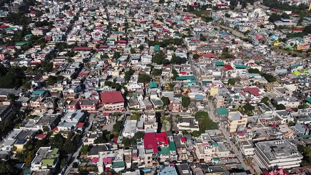 An Aerial landscape view of Mussoorie or Mussouri hill top peak city located in Uttarakhand India with colorful buildings