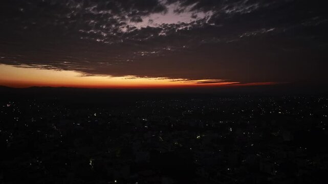 Experience nature's splendor with a vibrant sunset casting an orange hue over Dehradun City, Uttarakhand, India. Mesmerizing cloudscape completes the scene, offering a breathtaking dawn