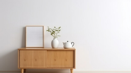 wooden cabinet with ceramic vase and cup on its and white wall background. modern and cozy living room interior deign. generative AI