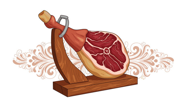 Traditional Spanish or Iberian cured ham, known as jam�n, displayed on a sturdy wooden stand, ready for slicing, with decorative swirls in the background.