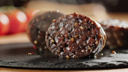 A closeup of traditional Spanish morcilla or blood sausage expertly sliced to reveal its rich dark and textured interior This gourmet delicacy is beautifully presented on an elegant slate serving boa.