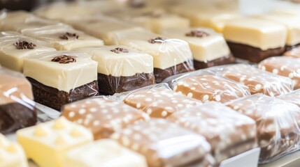 Assorted delectable desserts wrapped in plastic, displayed in a bakery with soft lighting