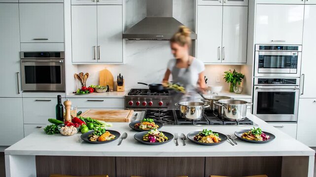 Fit woman prepares nutritious meal in modern kitchen for sports nutrition