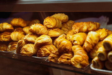Traditional sfogliatella riccia pastries arranged on a bakery display