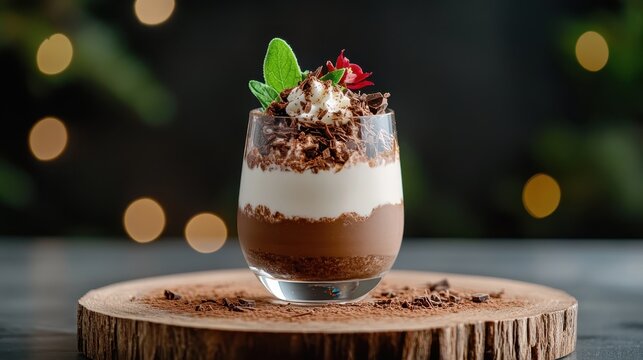 A charming chocolate parfait layered delectably with whipped cream, topped with fresh herbs and vibrant flowers, elegantly arranged on a rustic wooden board.