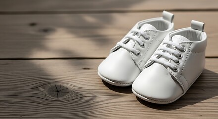 Tiny pristine white baby shoes with laces rest on weathered wooden planks bathed in soft dappled sunlight