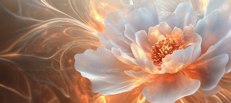The blossoming flower is beautifully captured in a vibrant digital illustration, boasting delicate orange petals and intricate white accents that convey a sense of peacefulness and sophistication
