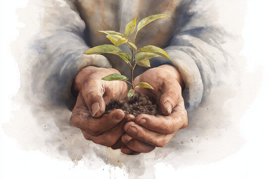 watercolor painting of hands holding a young plant, delicate greens and browns, gentle and hopeful style