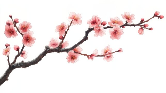 Watercolor painting of a delicate pink cherry blossom branch with soft petals and brown branches isolated on a white background.