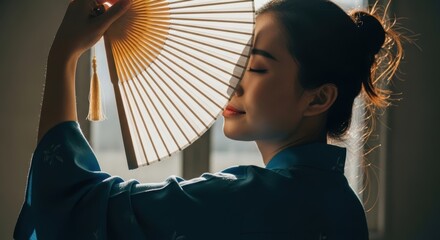 Asian young woman in traditional kimono with fan in soft lighting