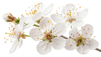 Creative set collection with Blooming of delicate pink flowers falling in the air, isolated on white background. Prunus cerasifera 'Nigra' or Canadian black plum
