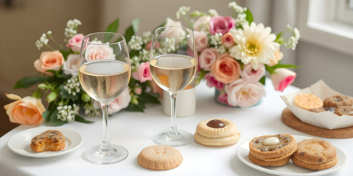 A beautifully arranged table features a glass of white wine, assorted snacks including cookies and pastries, and a bouquet of fresh flowers