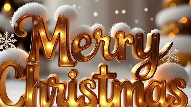 Warm “Merry Christmas” typography with snowflakes gently landing on letters, fluffy snow caps, soft golden lights behind, bokeh winter lights, cozy festive atmosphere, delicate snowfall, high-detail