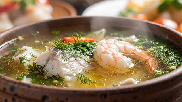 A closeup shot of a steaming delicious seafood soup served in a rustic clay bowl featuring succulent shrimp tender fish pieces and fresh green herbs like dill creating an inviting and appetizing culi.