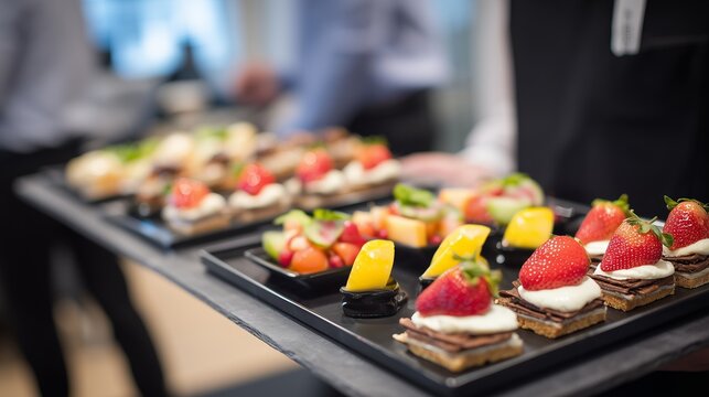 Server presents assorted miniature gourmet pastries and appetizers on a dark platter