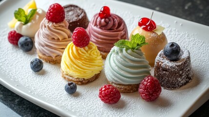 Delicious selection of colorful cream pastries served on a white platter with berries and mint leaves