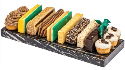 Assortment of exquisite pastries arranged on a dark marble platter.  Rich colors and textures highlight the variety of treats